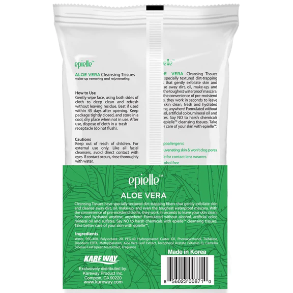epielle Aloe Vera Temizleme Mendilleri, cildi nazikçe eksfoliye eden ve kiri, yağı, makyajı ve hatta en dayanıklı suya dayanıklı maskarayı bile temizleyen özel dokulu kir tutucu liflere sahiptir. Önceden nemlendirilmiş bezlerin rahatlığıyla, saniyeler içinde cildinizin her zaman, her yerde temiz, taze ve nemli kalmasını sağlar! Yapay renklendirici, mineral yağ veya sülfat İÇERMEZ. Epielle temizleme mendilleri ile sert kimyasallara hayır deyin. Epielle ile cildinize daha iyi bakım yapın.