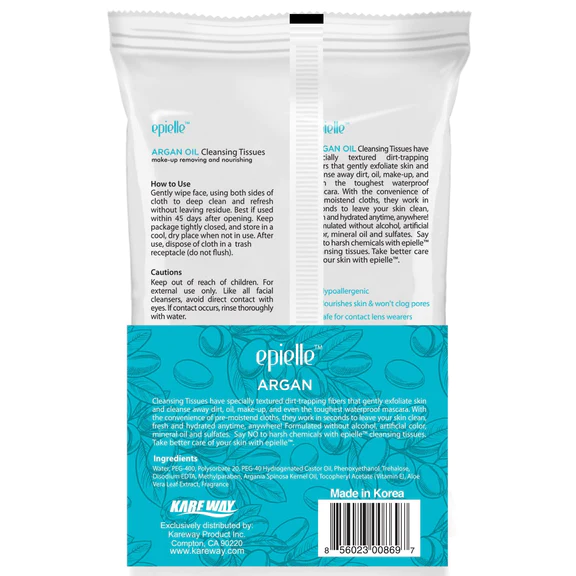 epielle Argan Yağlı Temizleme Mendilleri, cildi nazikçe eksfoliye eden ve kiri, yağı, makyajı ve hatta en dayanıklı suya dayanıklı maskarayı bile temizleyen özel dokulu kir tutucu liflere sahiptir. Önceden nemlendirilmiş bezlerin rahatlığıyla, saniyeler içinde cildinizin her zaman, her yerde temiz, taze ve nemli kalmasını sağlar! Yapay renklendirici, mineral yağ ve sülfat İÇERMEZ. Epielle temizleme mendilleri ile sert kimyasallara hayır deyin. Epielle ile cildinize daha iyi bakım yapın.