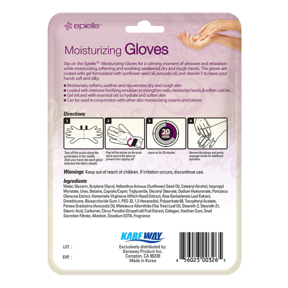 Zayıflamış, kuru ve pürüzlü ayakları nemlendirir, yumuşatır ve rahatlatırken sakinleştirici bir zevk ve rahatlama anı için e pielle Nemlendirici Eldivenleri giyin . Çoraplar, ellerinizi yumuşak ve ipeksi bırakmak için ayçiçeği çekirdeği yağı, avokado yağı ve E vitamini ile formüle edilmiş jel ile kaplanmıştır.