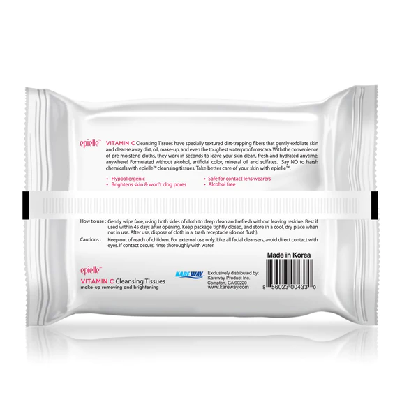 epielle C Vitamini Temizleme Mendilleri, cildi nazikçe eksfoliye eden ve kiri, yağı, makyajı ve hatta en dayanıklı suya dayanıklı maskarayı bile temizleyen özel dokulu kir tutucu liflere sahiptir. Önceden nemlendirilmiş bezlerin rahatlığıyla, saniyeler içinde cildinizin her zaman, her yerde temiz, taze ve nemli kalmasını sağlar! Alkol, yapay renklendirici, mineral yağ ve sülfat olmadan formüle edilmiştir. Epielle temizleme mendilleri ile sert kimyasallara hayır deyin. Epielle ile cildinize daha iyi bakım yapın.