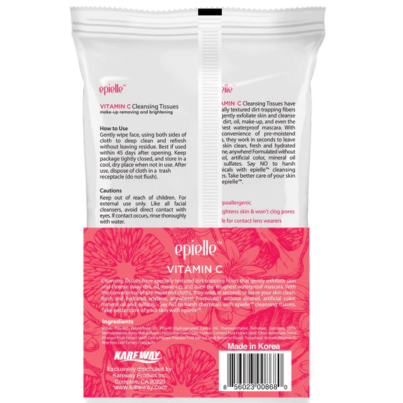 epielle C Vitamini Temizleme Mendilleri, cildi nazikçe eksfoliye eden ve kiri, yağı, makyajı ve hatta en dayanıklı suya dayanıklı maskarayı bile temizleyen özel dokulu kir tutucu liflere sahiptir. Önceden nemlendirilmiş bezlerin rahatlığıyla, saniyeler içinde cildinizin her zaman, her yerde temiz, taze ve nemli kalmasını sağlar! Alkol, yapay renklendirici, mineral yağ ve sülfat olmadan formüle edilmiştir. Epielle temizleme mendilleri ile sert kimyasallara hayır deyin. Epielle ile cildinize daha iyi bakım yapın.