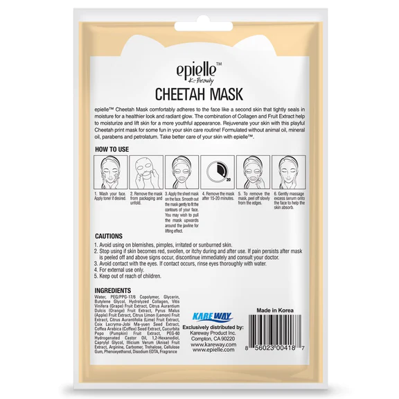 Epielle Cheetah Mask, yüzde ikinci bir cilt gibi rahatça yapışır ve daha sağlıklı ve parlak bir görünüm için nemi sıkıca kapatır. Kollajen ve meyve özlerinin kombinasyonu, cildi nemlendirmeye ve genç bir görünüm için kaldırmaya yardımcı olur. Bu oyuncu Leopar desenli maske ile cildinizi canlandırın ve cilt bakım rutininize eğlence katın! Hayvan yağı, mineral yağı, paraben ve petrolatum içermeyen formülü ile cildinize daha iyi bakım yapın.