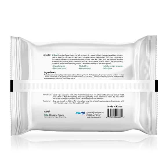 epielle Cica Temizleme Mendilleri, cildi nazikçe eksfoliye eden ve kiri, yağı, makyajı ve hatta en dayanıklı suya dayanıklı maskarayı bile temizleyen özel dokulu kir tutucu liflere sahiptir.