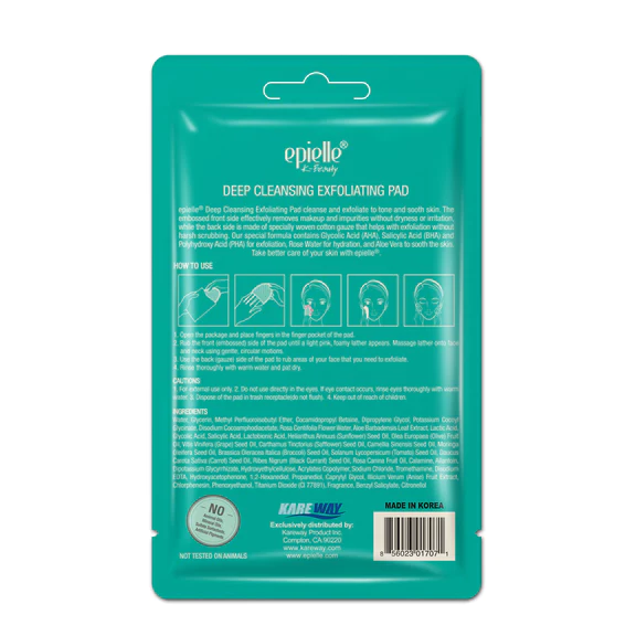 epielle® Derin Temizleyici Eksfoliasyon Pedi , cildi temizleyerek rahatlatır ve rahatlatır. Kabartmalı ön taraf, kuruluk veya tahriş olmaksızın makyajı ve kirleri etkili bir şekilde temizlerken, arka taraf, sert ovalama olmadan pul pul dökülmeye yardımcı olan özel dokunmuş pamuklu gazlı bezden yapılmıştır. Özel formülümüz, peeling için Glikolik Asit (AHA), Salisilik Asit (BHA) ve Polihidroksi Asit (PHA), nemlendirme için Gül suyu ve cildi rahatlatmak için Aloe Vera içerir. Epielle®ile cildinize daha iyi bakın