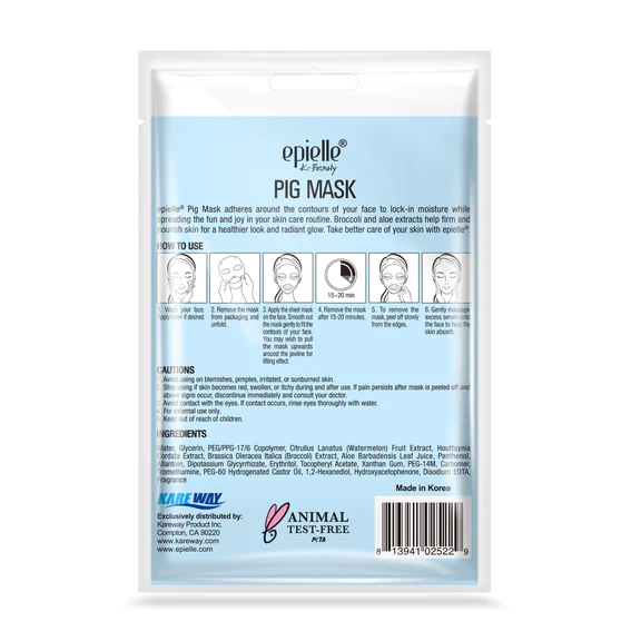 epielle® Pig Maskesi, yüzünüzün kontürlerine sıkıca yapışarak nemi kilitlerken cilt bakım rutininize eğlence ve neşe katıyor. Brokoli ve aloe özleri, cildi sıkılaştırmaya ve beslemeye yardımcı olarak daha sağlıklı bir görünüm ve parlak ışıltı elde etmenize yardımcı olur. Cildinize epielle® ile daha iyi bakın.