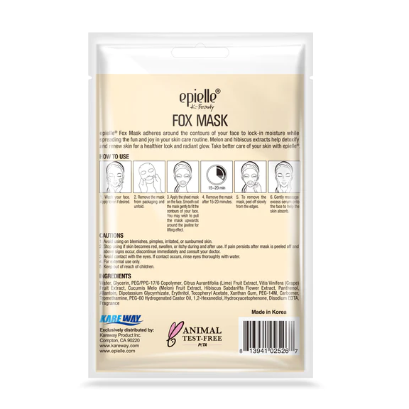 epielle® Fox Karakter Maskesi, yüzünüzün kontürlerine sıkıca oturarak nemin kilidini açar ve cilt bakım rutininize eğlence ve neşe katar.